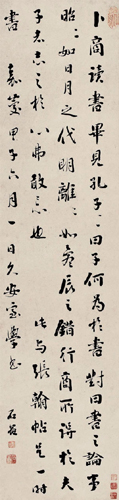 刘墉,1719年生,1804年逝世,山东诸城人。清代书法家。字崇如,号石庵、青原、香岩、日观峰道人。统勋子。乾隆进士、官体仁阁大学士,加太子太保,谥文清。书法浑厚雄劲,得钟太傅、颜鲁公神髓,一时名满天下。在乾隆之际,翁方纲、梁同书、王文治、刘墉并享书法声誉。当时人们称翁、梁、王、刘“四大家”。其书法艺术成就,当推刘墉最高。亦有以来其与翁方纲、成亲王永瑆、铁保并称“翁刘成铁”。包世臣《艺舟双楫》称:“文清少习香光,壮迁坡志,七十以后潜心北朝碑版,虽精力已衰,未能深造,然意兴学识,超然尘外。”近人康有为《广艺舟双楫》称“石庵亦出董(其昌),然大厚思沉,筋摇脉聚,近世行草作浑厚一路,未有能出石庵之范围者,吾故谓石庵集帖学之成也。流传书迹较多。著有《石庵诗集》,刻有《清爱堂帖》。《小楷册》,书于嘉庆元年(1796)。纸本墨迹。凡24行,共360字。各页均纵11.8厘米,横6.9厘米。故宫博物院藏。刘墉的书法,初看圆润软滑,若团团棉花,细审则骨络分明,内含刚劲。刘墉精于小楷,其特色由此件作品可窥一斑。他书的蝇头小楷具有擘窠大字的恢宏气象,结体丝毫不令人觉得拘紧,点画洁净讲究。尤其粗重与纤细交织在一起,加之偶尔揉入行草笔意,使得整个作品在规模的大效果中不乏生动活泼的情趣,这是十分难能可贵的。后世人们称许他的小楷不仅有钟繇、王羲之、颜真卿、苏轼的法度,还深得魏、晋小楷风致,实不为过。